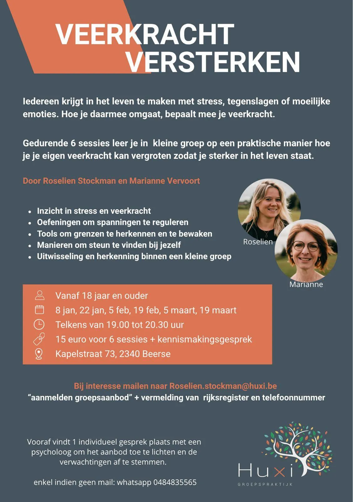 Dit traject bestaat uit 6 sessies en wordt begeleid door ervaren therapeuten. Het is bedoeld voor volwassenen die sterker in het leven willen staan en op zoek zijn naar meer rust, balans en zelfvertrouwen.